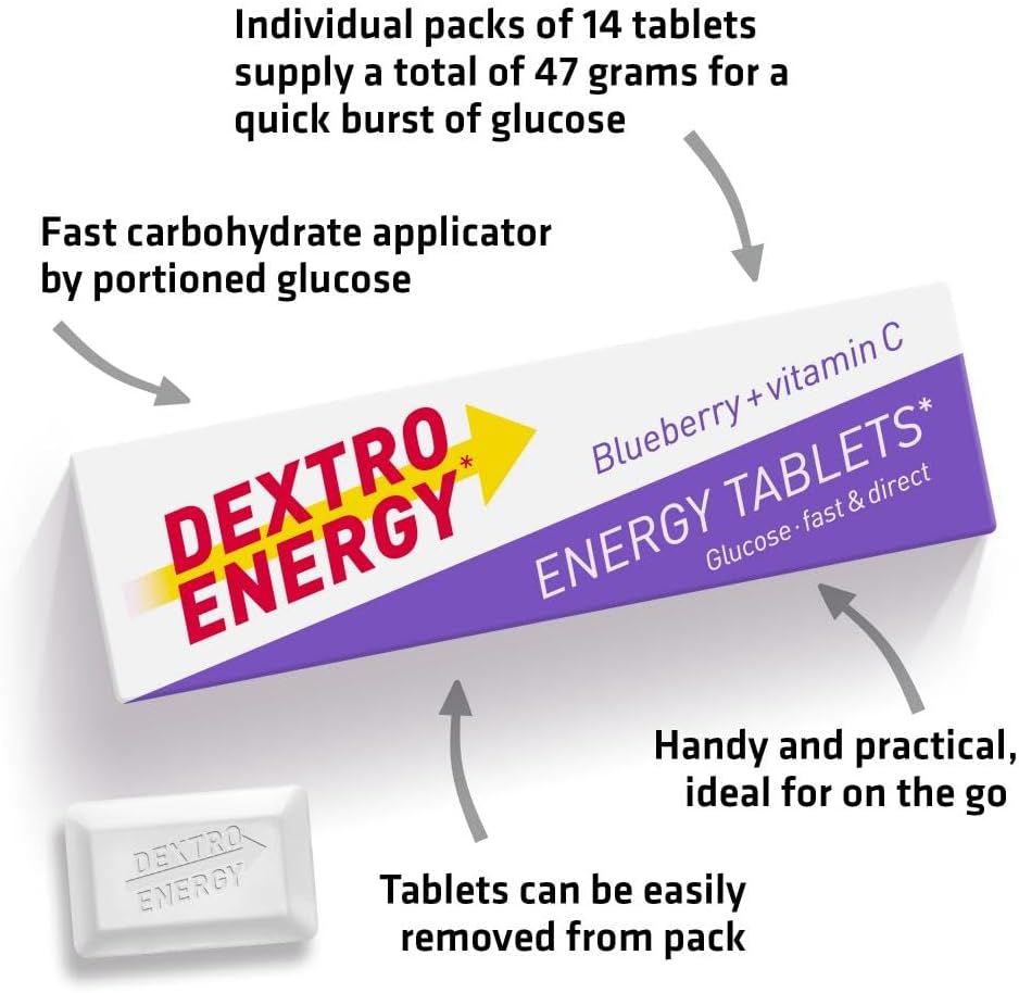 Get a burst of fruity energy with Dextro Energy Blueberry Glucose Tablets. This pack of 24 x 47g boxes provides a rapid source of glucose with a delicious blueberry flavour, perfect for athletes, students, and anyone needing a fast energy lift.